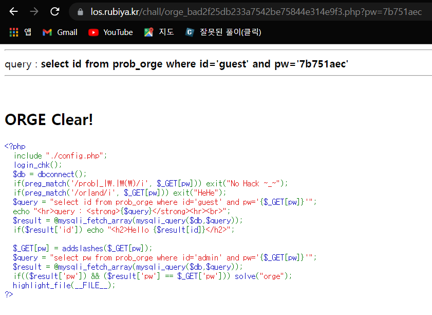 if(($result['pw']) && ($result['pw'] == $_GET['pw'])) solve("orge");